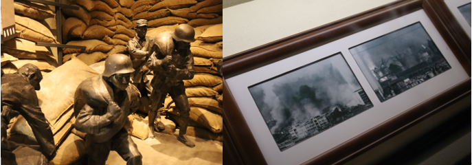 彈痕猶在,英魂不朽。四行倉庫保衛戰,是上海“八一三淞滬抗戰”中最后的戰場。在晉元紀念廣場上,滿目蒼夷的四行倉庫紀念館西墻以累累彈痕無聲述說著中華民族浴血奮戰的悲壯歷史。展廳通過實物展品、巨幅雕塑、戰斗場景蠟像等生動再現了在抗日民族統一戰線旗幟下和全面抗戰的背景下,上海人民投身全民族抗戰、共御外侮的歷史歲月和孤軍奮戰、頑強堅守的“八百壯士”的英雄事跡。