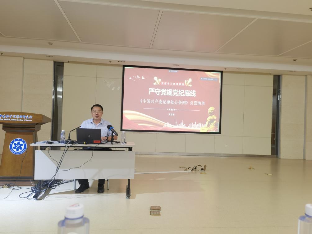 黨委書記黃藝東以“嚴守黨規黨紀底線——《條例》負面清單”為題講授專題黨課。他聚焦六項紀律“負面清單”,聯系研究所思想、工作和生活實際,以大量身邊的案例逐條解釋了負面清單。他指出,要把開展黨紀學習教育與推動研究所各項重點工作結合起來,融入日常、抓在經常,做到學紀、知紀、明紀、守紀,把遵規守紀刻印在心,內化為言行準則,為支撐保障搶占科技制高點提供做好政治和思想保障。
