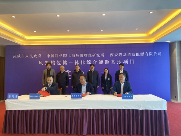 3月10日上午,在河西走廊重鎮——武威,中國科學院上海應用物理研究所、甘肅省武威市人民政府、西安隆基清潔能源有限公司就一體化綜合能源基地示范項目進行了研討與交流。三方共同簽訂了一體化綜合能源基地示范項目合作框架協議,致力于構建新型現代能源示范體系。武威市委書記柳鵬,市委副書記、市長周偉,市委常委、常務副市長王國斌,上海應物所所長戴志敏,所務委員王建強,西安隆基清潔能源有限公司董事長張長江等出席了簽約儀式。?