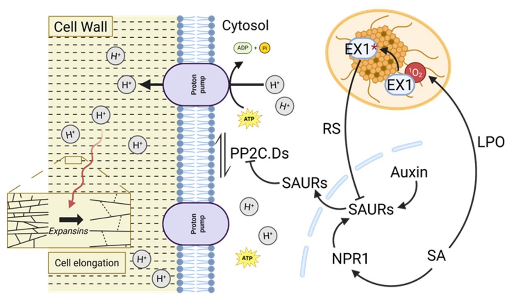 為了解決這一空白,研究小組對脅迫激素水楊酸(SA)是如何在黑暗中調節擬南芥發芽過程中的下胚軸伸長做出了研究。在這項研究中,闡述了SA抑制的下胚軸生長呈劑量依賴性,并且npr1突變體對于SA處理更為敏感,強調了NPR1在黑暗中SA積累下維持生長的作用。與此同時,該研究發現了核定位的NPR1通過維持生長素應答基因(比如SAURs和EXPs)的表達以此消減SA誘導的生長抑制。過表達SAUR19或SAUR63的確完全恢復了npr1在黑暗中的表型。再者,此研究闡述了SA在黑暗中觸發脂質過氧化(lipid peroxidation),產生1O2并激活EX1介導的逆向信號(從黃化質體到細胞核),從而抑制生長素相關基因,限制下胚軸伸長。