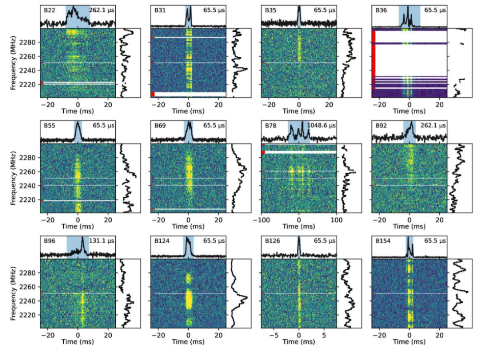 圖1:天馬探測到的FRB 20240114A部分爆發(fā)示意圖。每個(gè)子圖中間展示該爆發(fā)的動態(tài)譜,上方和右側(cè)則分別為該爆發(fā)的時(shí)域和頻域輪廓