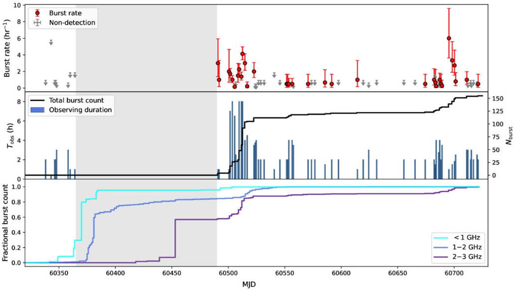 圖2:FRB 20240114A在2.25 GHz的爆發(fā)率隨時(shí)間變化(上), 天馬各次觀測的時(shí)長和累計(jì)探測到的爆發(fā)數(shù)目(中),以及結(jié)合其它望遠(yuǎn)鏡觀測結(jié)果得到的該源不同頻率區(qū)間內(nèi)探測到的爆發(fā)數(shù)目的累積分布(下)