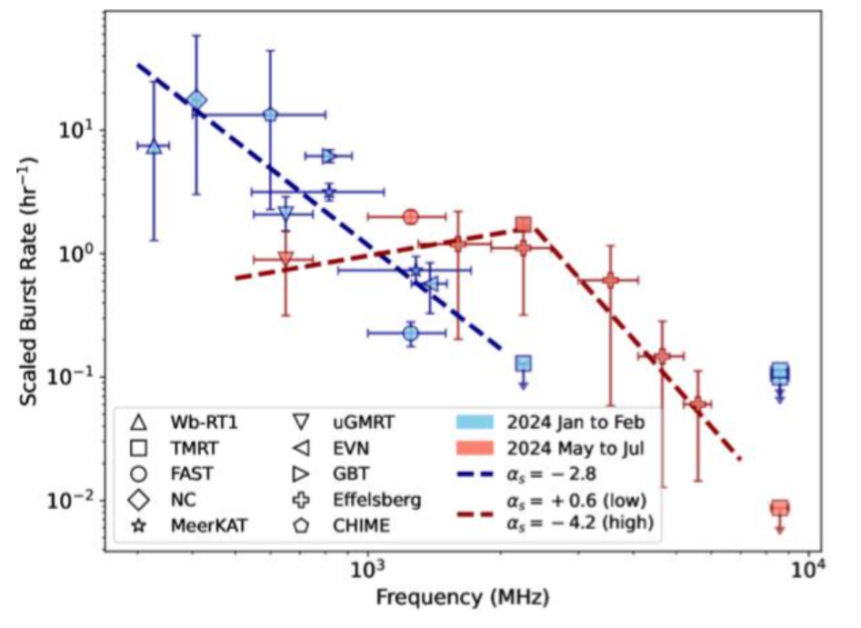 圖3:FRB 20240114A在2024年1-2月(藍(lán)色)與5-7月(紅色)期間的爆發(fā)率隨觀測頻率的變化(不同望遠(yuǎn)鏡的觀測結(jié)果均依據(jù)天馬的探測閾值進(jìn)行縮放),可以看出該源爆發(fā)率的頻率依賴特性在兩個(gè)時(shí)期之間發(fā)生了明顯變化