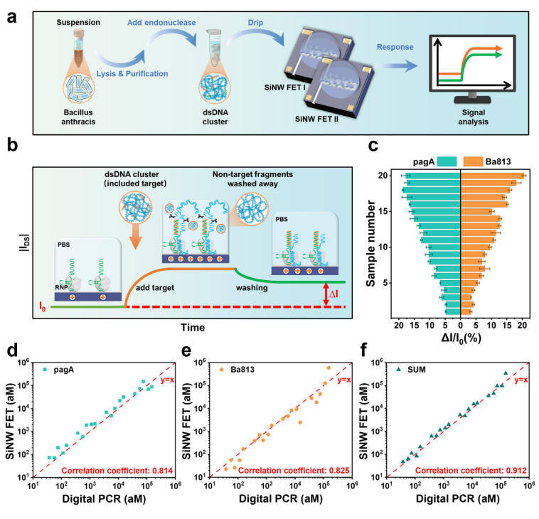 病原體核酸的快速、靈敏與準確檢測對于公共安全和人類健康至關重要。近日,中國科學院上海微系統與信息技術研究所李鐵團隊提出一種基于CRISPR/Cas12a體系功能化的硅納米線場效應晶體管(SiNWs FET)新型檢測策略,實現了對病原體雙鏈DNA的超靈敏、快速、直接檢測。該傳感器利用Cas12a/crRNA復合物的精準識別與切割功能,對長鏈核酸中的靶序列進行快速掃描和特異切割,有效解決了核酸折疊與纏繞導致的檢測效率低和信號不穩定問題。通過將長雙鏈DNA切割為特定長度片段,使其分布于德拜長度范圍內,從而顯著提升靈敏度與信號一致性。實驗結果表明,該策略可在10分鐘內完成炭疽芽孢桿菌雙鏈DNA的定量檢測,檢測限達阿摩爾(aM)級。對真實全基因組樣品的檢測結果與數字PCR的相關系數達到0.912,驗證了其高可靠性與實際應用潛力。