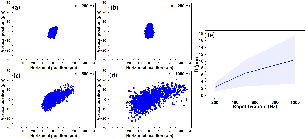 圖1?不同重復(fù)頻率下的光絲產(chǎn)生太赫茲光束指向分布云圖。(a)200Hz,(b)250Hz,(c)500Hz,(d)1000Hz;(e)光束指向平均偏差距離(藍色實線)和其誤差(藍色陰影)隨激光重復(fù)頻率變化的函數(shù)。