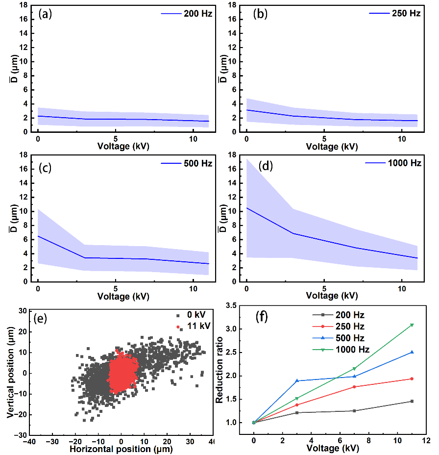 圖2 不同重頻下光絲產(chǎn)生太赫茲指向抖動隨外加直流電場電壓的變化關(guān)系:(a)200 Hz,(b)250 Hz,(c)500 Hz,(d)1000 Hz;(e)有無外加直流電場下1000Hz光絲產(chǎn)生太赫茲輻射的指向分布;(f)光絲產(chǎn)生太赫茲指向抖動降低率。